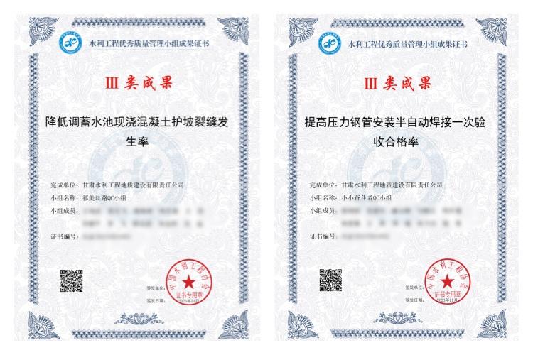为深入贯彻落实中共中央、国务院印发的《质量强国建设纲要》,提升和强化水利工程施工质量意识,弘扬“工匠精神”。地建公司于年中申报了《降低调蓄水池现浇混凝土护坡裂缝发生率》和《提高压力钢管安装半自动焊接一次验收合格率》两项QC课题,并于10月参加了由中国水利工程协会举办的“2023年度水利工程优秀质量管理小组成果发布会”。经评审,两项QC课题均荣获中国水利工程优秀质量管理活动Ⅲ类成果。