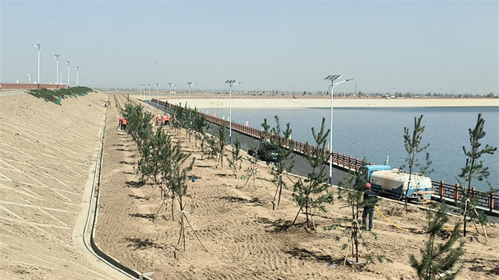 调蓄水池主体结构已经完工,施工人员正紧张有序地进行西营河与小沙河输水工程、西营河与海藏河输水工程土工膜铺设、格宾石笼护坦安装、生态砖铺装以及调蓄水池绿化工程。随着项目的最后冲刺阶段到来,各参建单位正紧锣密鼓地展开已完单位工程验收及竣工图纸绘制等工作,为后续合同工程完工验收做准备。