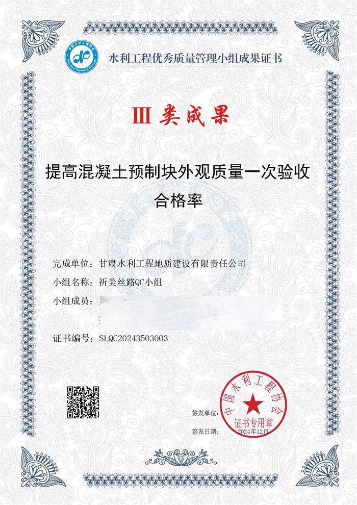 近日,从中国水利工程协会传来喜讯,地建公司申报的一项QC课题获评2024年度水利工程优秀质量管理小组成果Ⅱ类成果奖,两项QC课题均获中国水利工程优秀质量管理活动Ⅲ类成果。