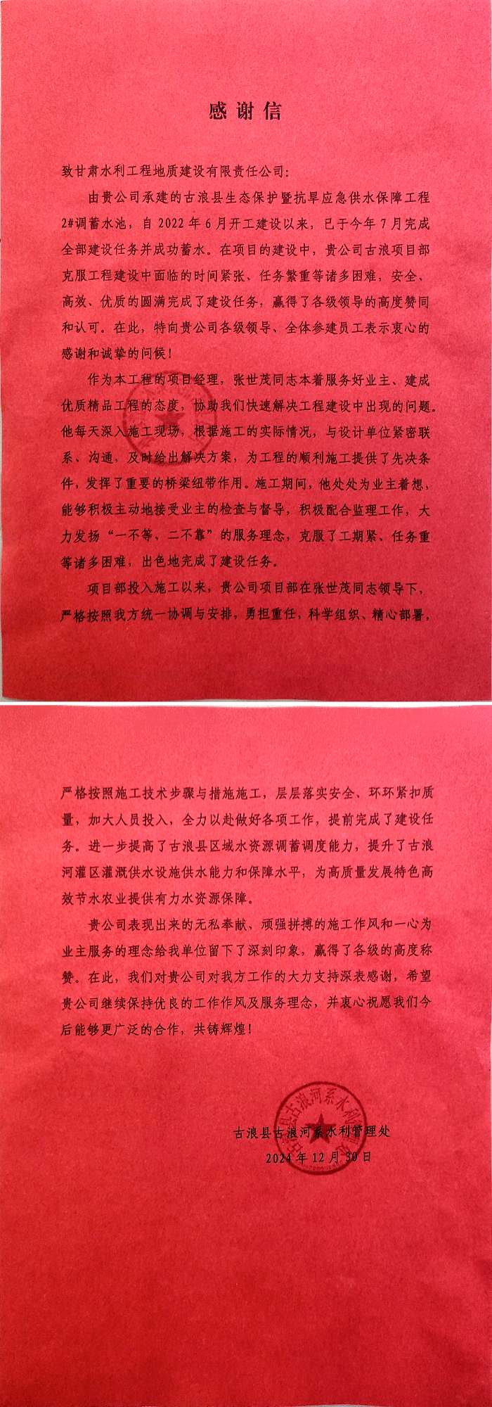 12月30日,古浪县古浪河系水利管理处向古浪县生态保护暨抗旱应急供水保障工程2#调蓄水池项目发来感谢信,对该项目全体参建员工在项目建设中顽强拼搏、心怀群众,全力以赴完成工程建设中体现的奉献精神和服务精神表示衷心的感谢和崇高的敬意。
